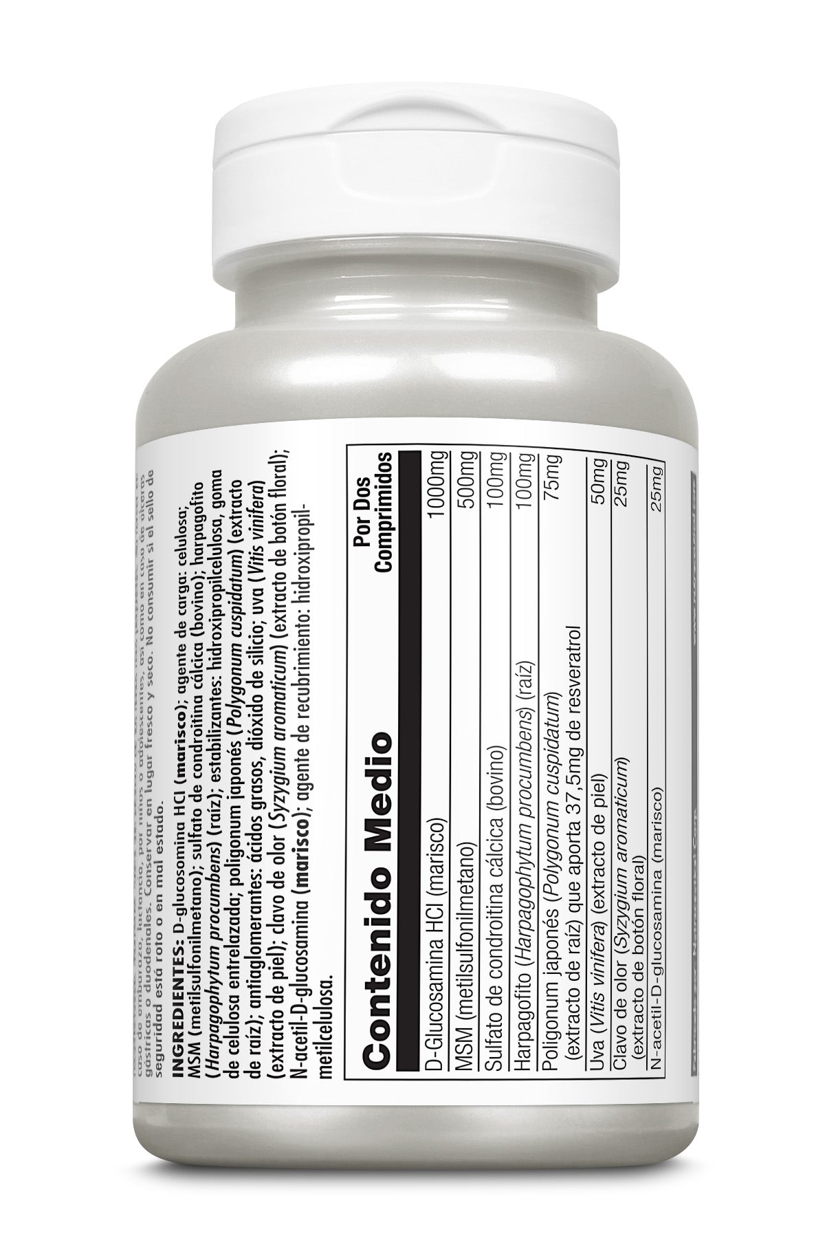 MSM (metilsulfonilmetano); sulfato de condroitina cálcica (bovino); harpagofito (Harpagophytum procumbens) (raíz); estabilizantes: hidroxipropilcelulosa, goma de celulosa entrelazada; poligonum japonés (Polygonum cuspidatum) (extracto de raíz); antiaglomerantes: ácidos grasos, dióxido de silicio; uva (Vitis vinifera) (extracto de piel); clavo de olor (Syzygium aromaticum) (extracto de botón floral);