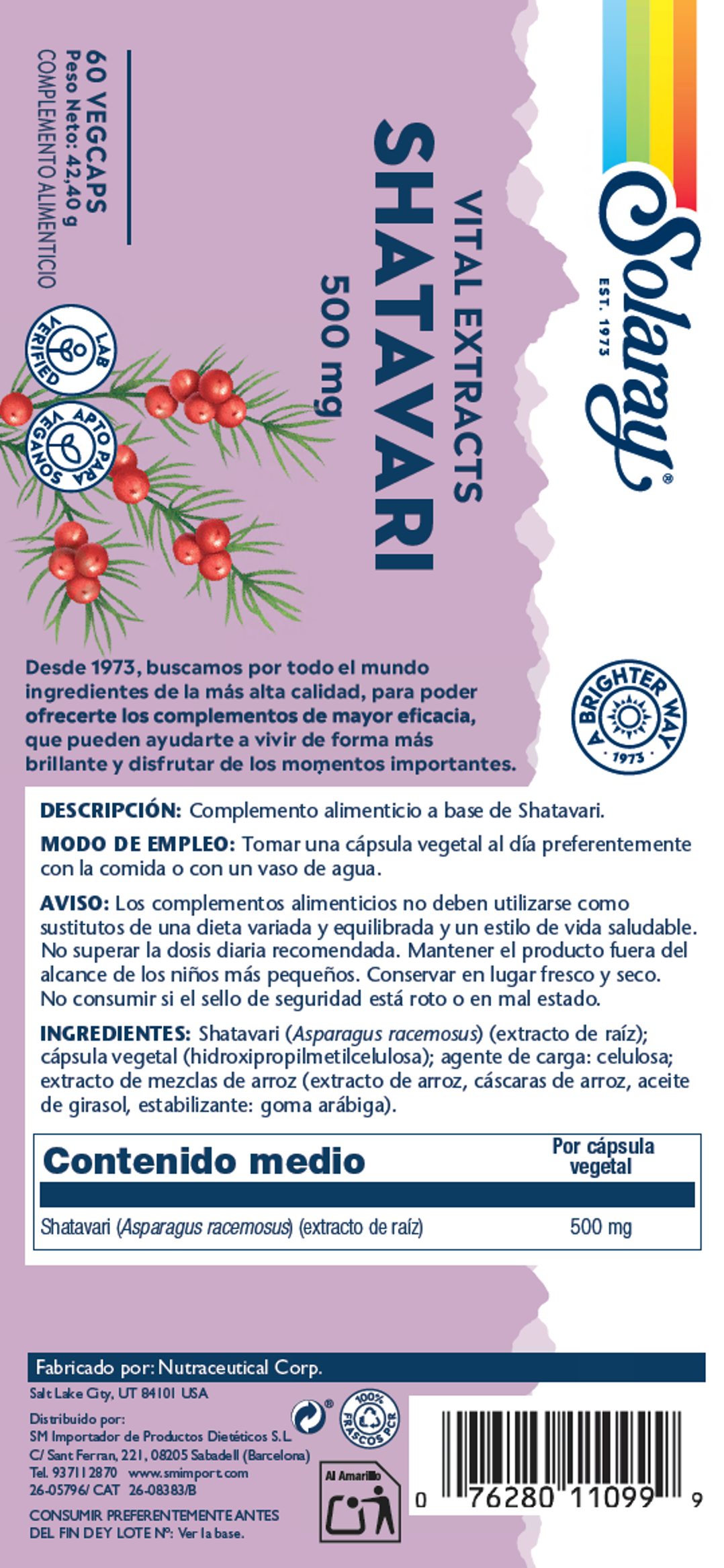 Shatavari (Asparagus racemosus ) (extracto de raíz); cápsula vegetal (hidroxipropilmetilcelulosa); agente de carga: celulosa; extracto de mezcla de arroz (extracto de arroz, cáscaras de arroz, aceite de girasol, estabilizante: goma arábiga).