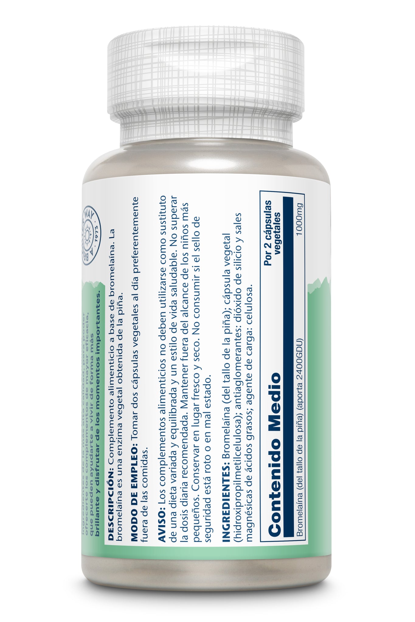 Complemento alimenticio a base de bromelaína. La bromelaína es una enzima vegetal obtenida de la piña.