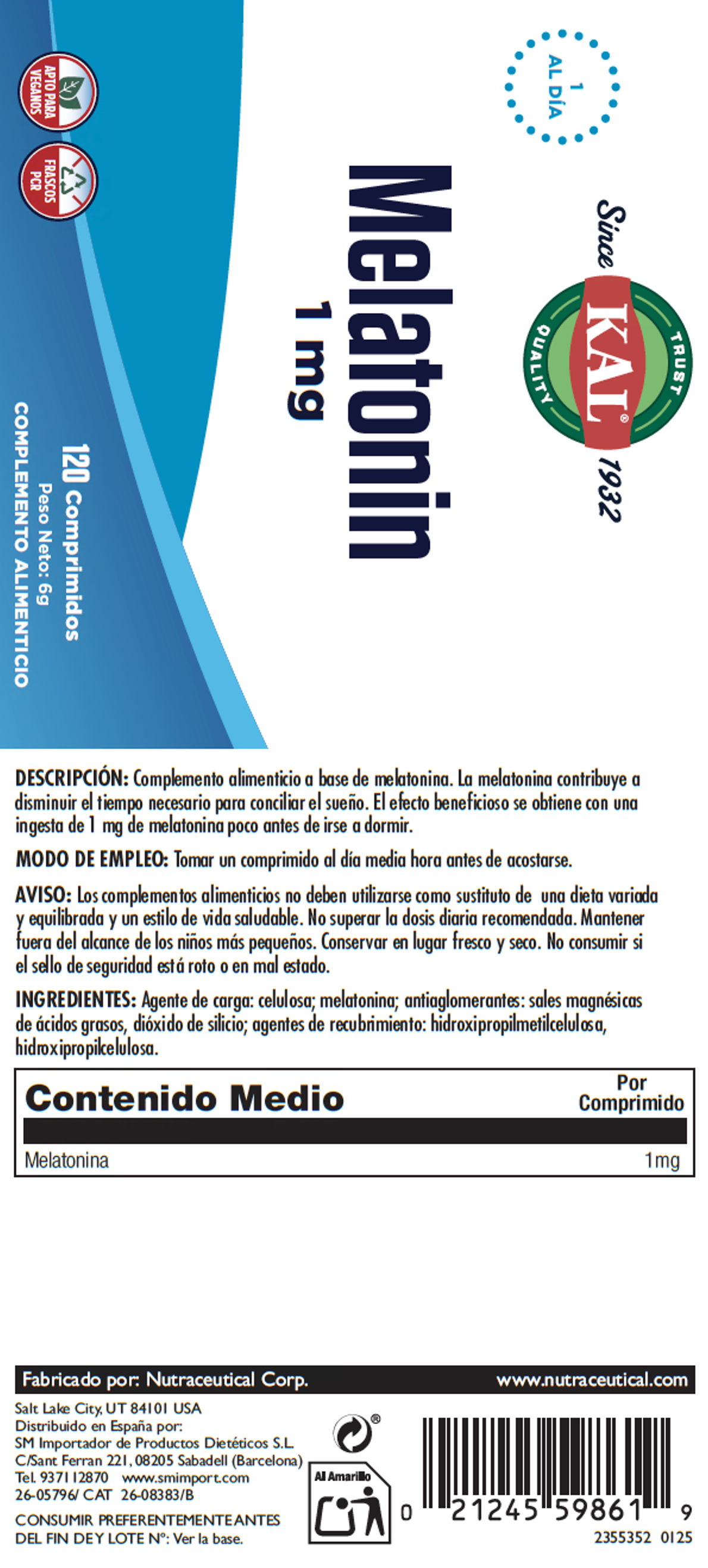 Complemento alimenticio a base de melatonina. La melatonina contribuye a disminuir el tiempo necesario para conciliar el sueño. El efecto beneficioso se obtiene con una ingesta de 1 mg de melatonina poco antes de irse a dormir.