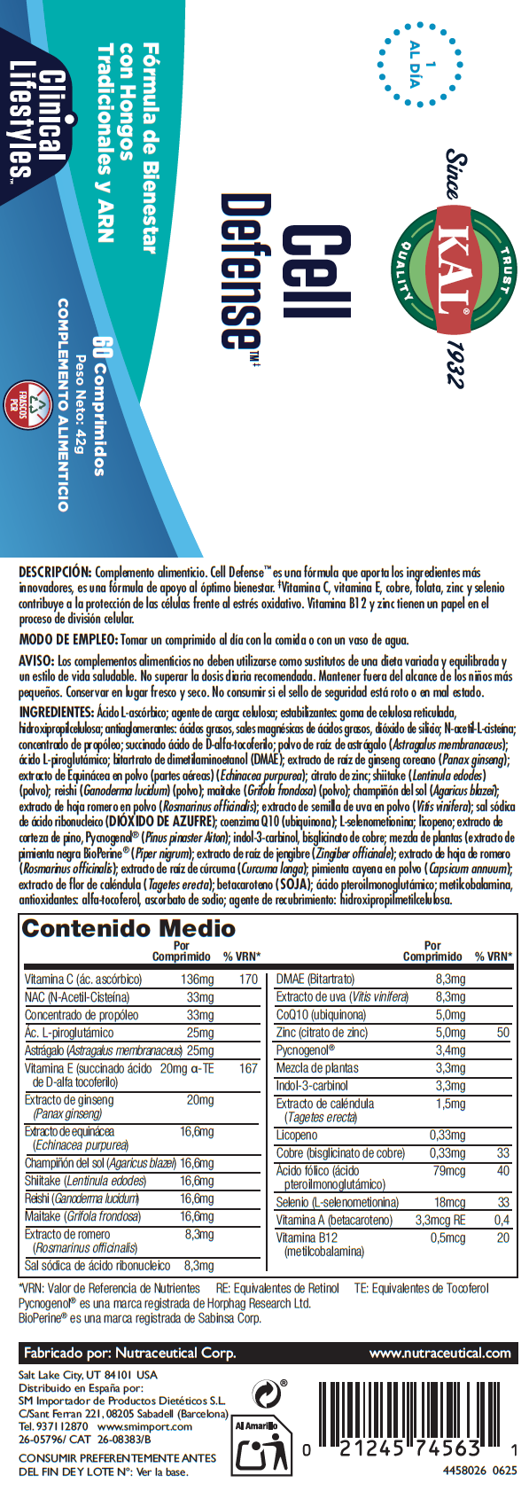 Complemento alimenticio. Cell Defense™ es una fórmula que aporta los ingredientes más innovadores, es una fórmula de apoyo al óptimo bienestar. ‡Vitamina C, vitamina E, cobre, folata, zinc y selenio contribuye a la protección de las células frente al estrés oxidativo. Vitamina B12 y zinc tienen un papel en el proceso de división celular.