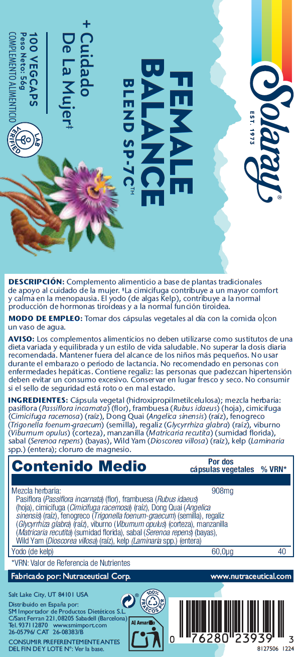Mezcla herbaria: Pasiflora ( Passiflora incarnata ) (flor), frambuesa ( Rubus idaeus ) (hoja), Cimicifuga (cimicifuga racemosa )(raíz), Dong Quai ( Angelica    sinensis ) (raíz), fenogreco ( Trigonella foenum-graecum )(semilla), regaliz ( Glycyrrihiza glabra ) (raíz),  viburno ( Viburnum opulus) (corteza), manzanilla ( Matricaria recutita ) (sumidad florida), sabal ( Serenoa repens )(bayas), Wild Yam  ( Discorea villosa )(raíz), kelp (Laminaria spp.) (entera). 908 mg Yodo (de Kelp) 60 mcg(VRN: 40%)