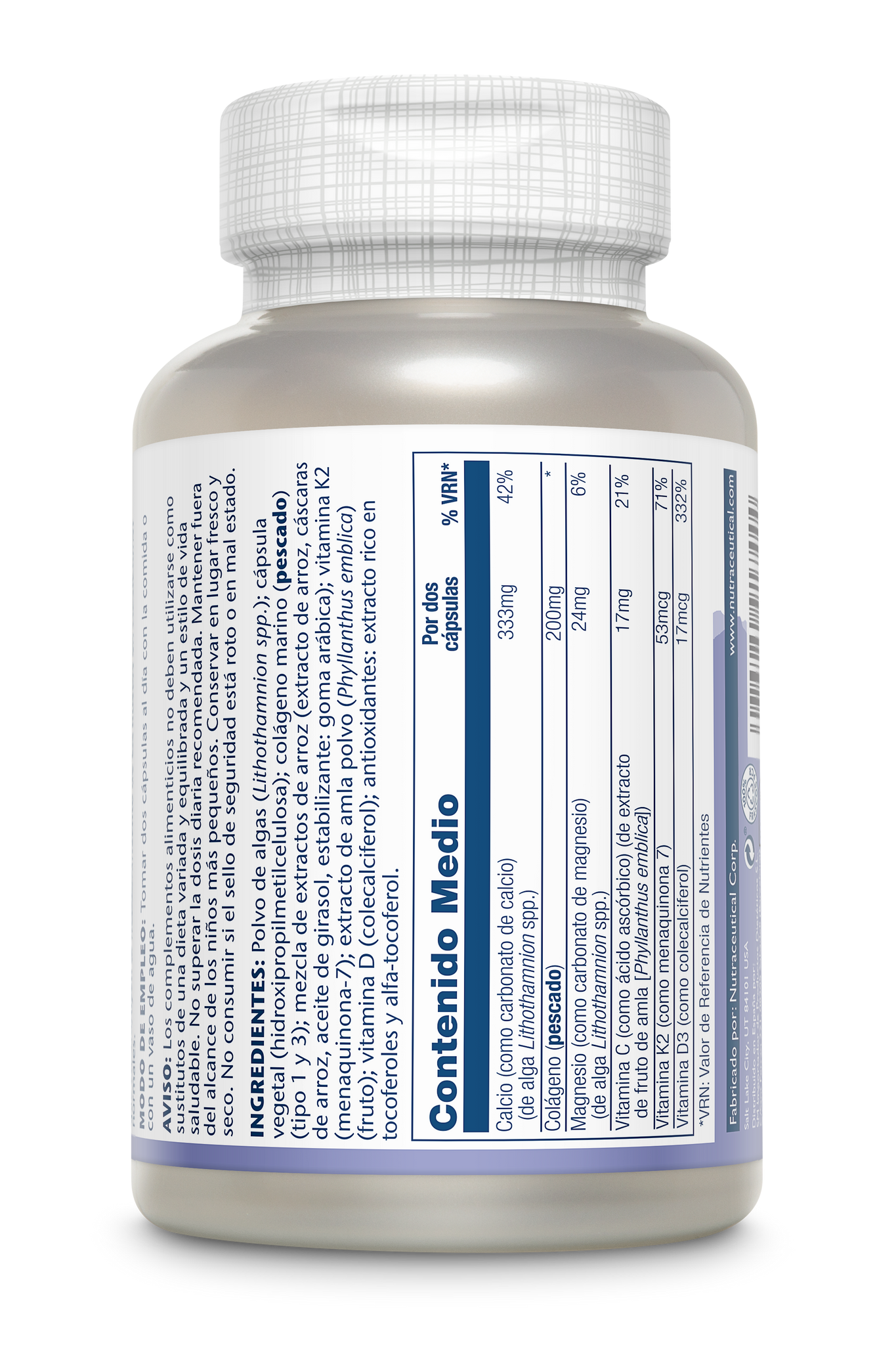 Complemento alimenticio a base de colágeno marino hidrolizado, magnesio de algas y vitaminas C, D3 y K2. ‡Con vitamina C que contribuye a la formación normal de colágeno para el funcionamiento normal de los huesos y vitamina D y K que contribuyen al mantenimiento de los huesos en condiciones normales.